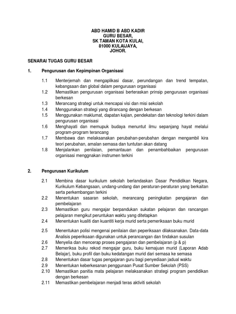Senarai Tugas Dan Tanggungjawab Guru Besar
