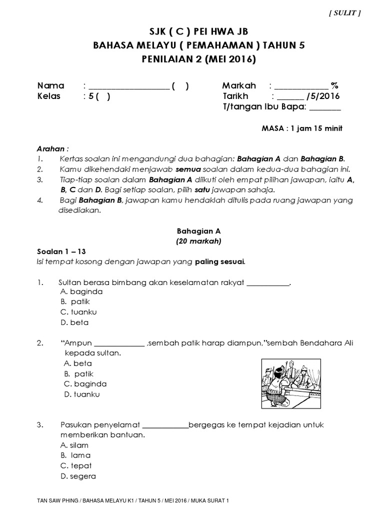 Sjk C Pei Hwa Jb Bm Kertas 1 Pksr 2 2016