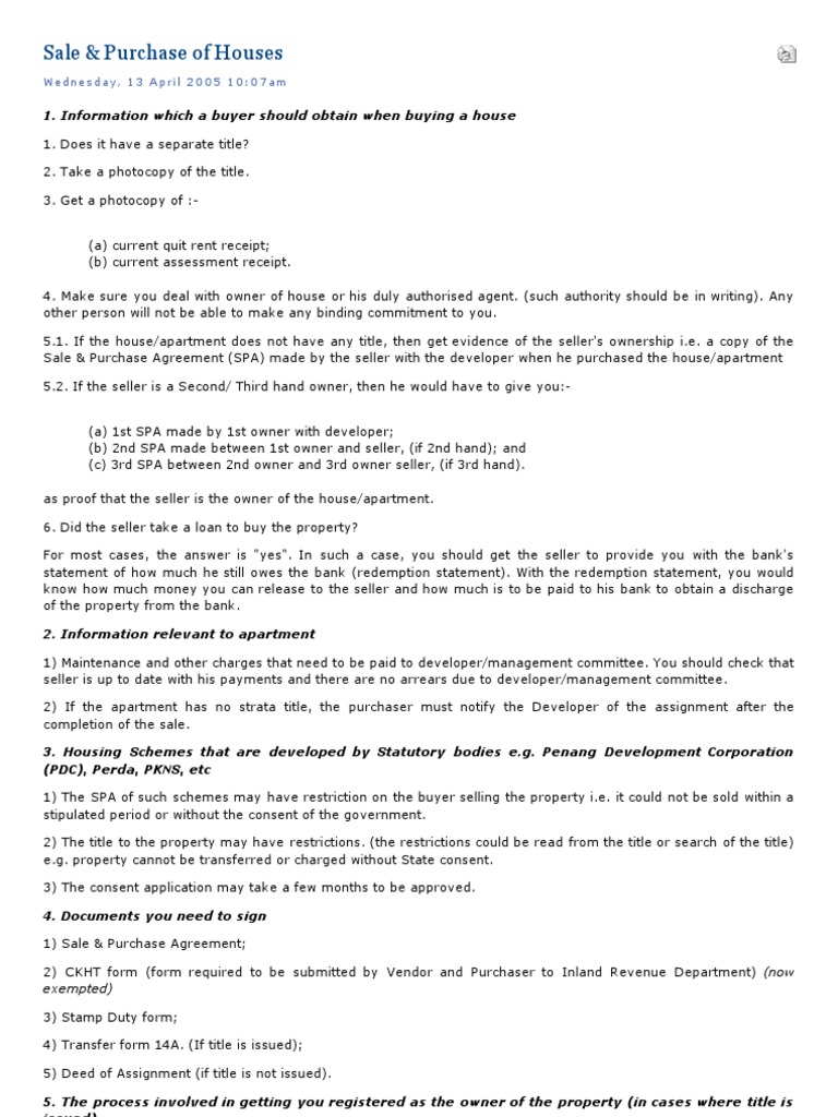 The Malaysian Bar Sale Purchase Of Houses Financial Transaction Deed