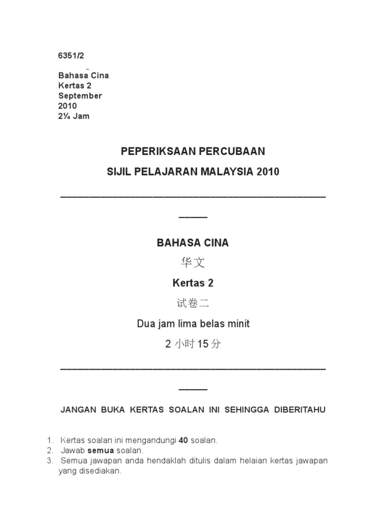 Percubaan Spm Bahasa Cina Kertas 2 Tahun 2016