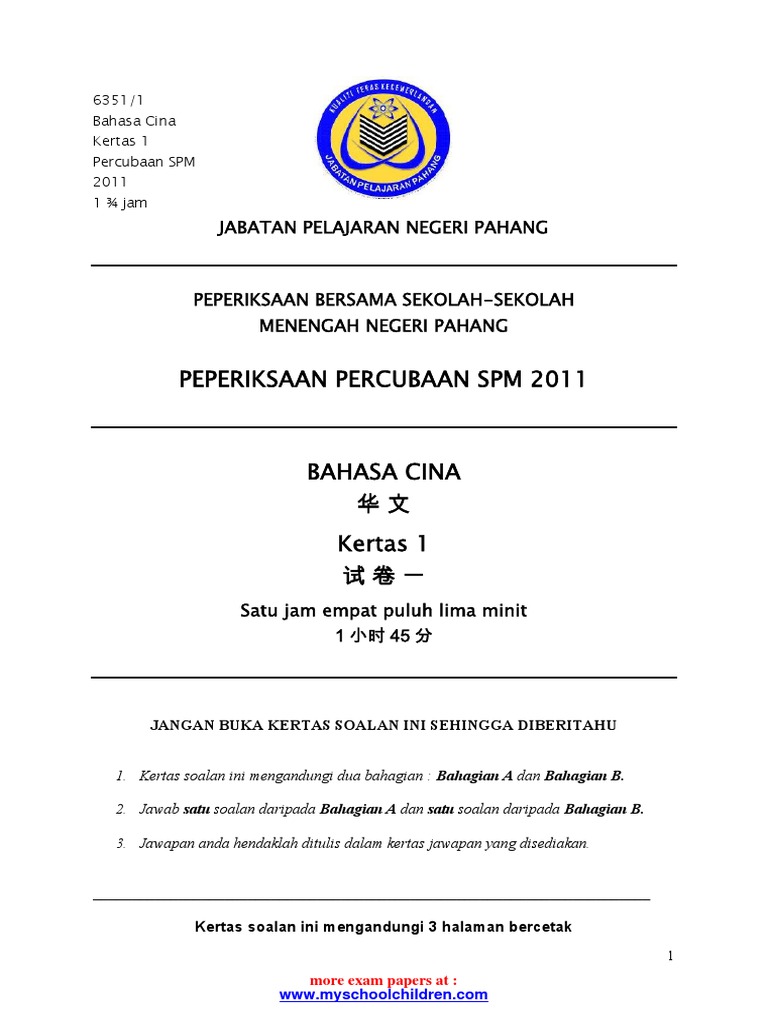 Bahasa Cina Kertas 1 2 Pahang Spm Trial S 2011