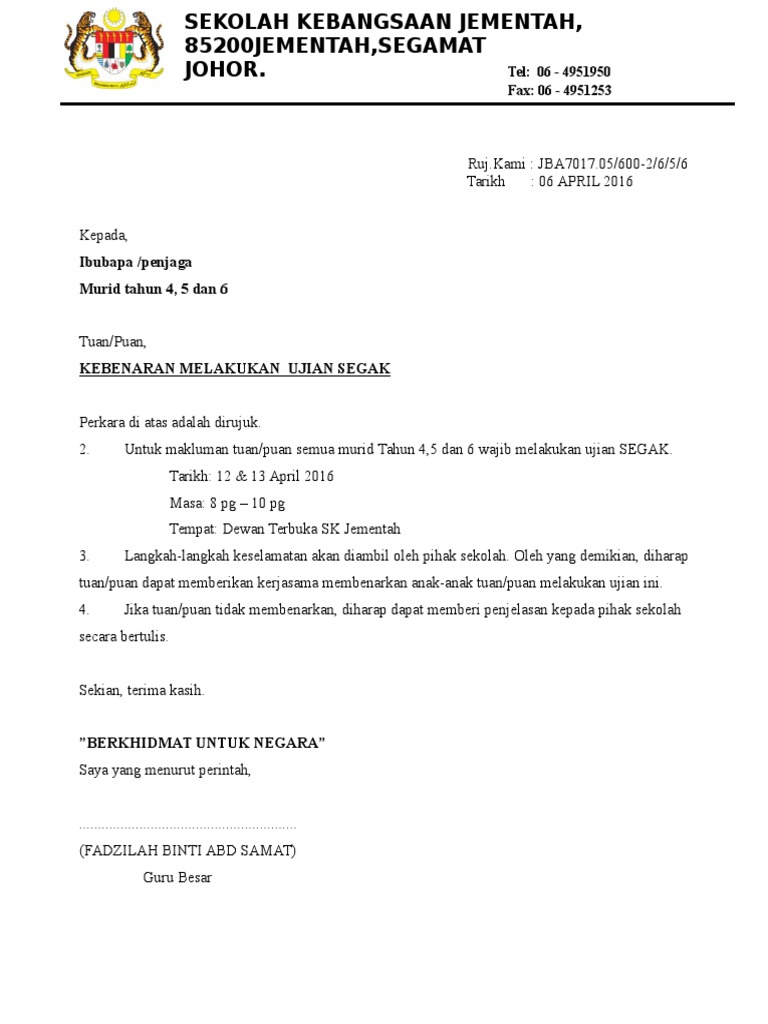 Surat Makluman Ujian Segak 2019