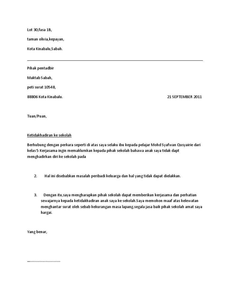 Surat Rasmi Tidak Hadir Ke Sekolah