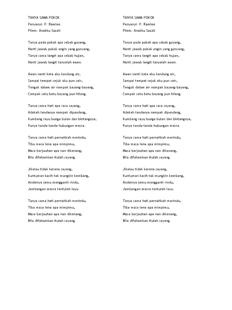 Awan nanti kata aku kandung air sampai tempat sejuk aku pun cair tengok dalam air nampak bayang bayang campak satu batu bayang pun hilang. Bm tanya sama pokok a apa sebab goyang d jawab angin e yang goncang bm terbang burung terbang p a atah sayap diduga d seandainya e rebah a kau masih ada a nanana. Tanya sama pokok apa sebab goyang jawab angin yang goncang bm a terbang burung terbang patah sayap diduga e f m a seandainya rebah kau masih ada a e terlalu mahu dan mahu terlupa apa yg belum a e terlalu banyak alasannya e duduk terdiam a e tak mudah namun tak susah terserah atas pilihan a e tersentuh hati mula luruh chorus.