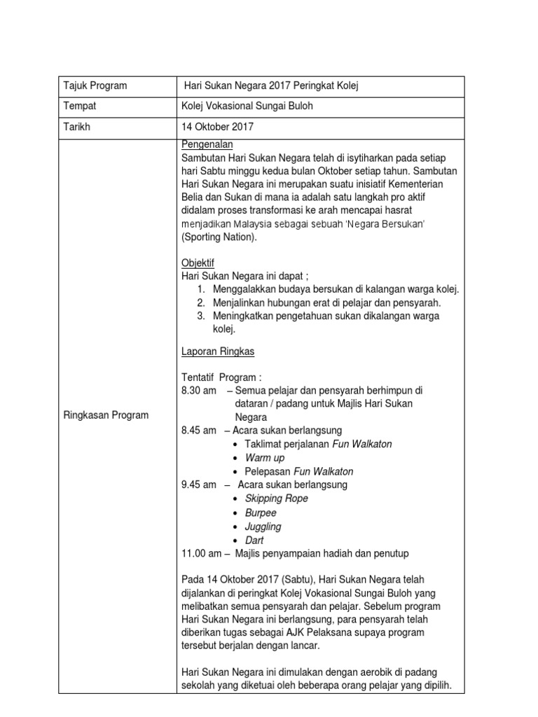 Kertas Kerja Hari Sukan Negara Peringkat Sk Skarok Oktober 2016