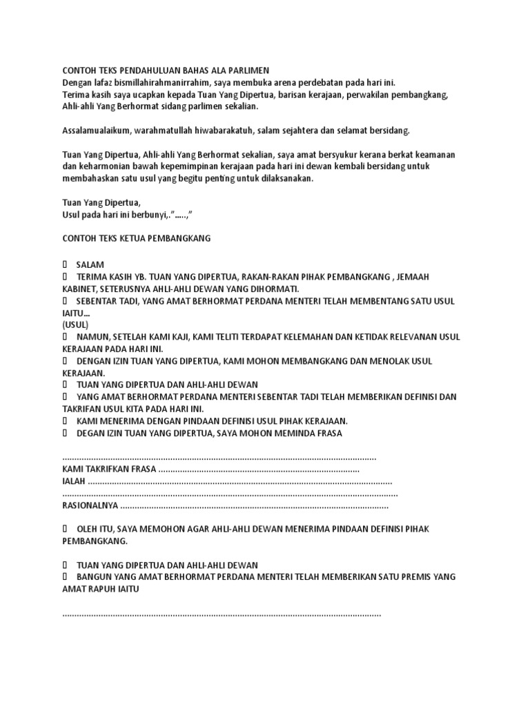 Doc Contoh Teks Pendahuluan Bahas Ala Parlimen A Tuan Yang Dipertua Dan Ahli Ahli Dewan A Kami Menerima Dengan Pindaan Definisi Usul Pihak Kerajaan A Degan Izin Tuan Yang Dipertua Saya Mohon Meminda
